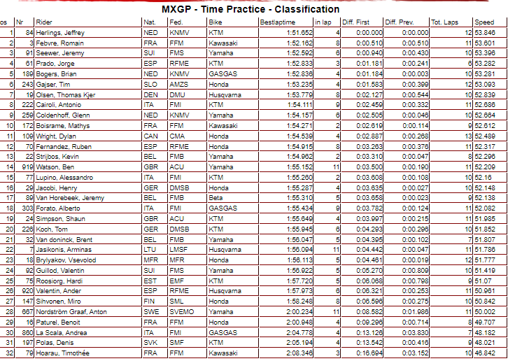 Jorge Prado y Jeremy Seewer se presentan como dos amenazas para luchar al frente. Tanto el gallego como el suizo se colaron dentro del top 5; a Jorge solo le bastaron tres vueltas para asegurar la cuarta plaza. Más atrás Rubén Fernández tuvo una dura caída en la zona de olas pero afortunadamente no fue nada grave y pudo volver a pista para seguir rodando, al final de los cronos fue 12. De esta manera termina la última clasificación del año, con Herlings logrando su pole número 13 de 18 rounds.