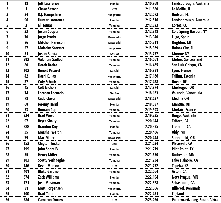 Jett Lawrence (Honda HRC) se ha adjudicado la pole position en Washougal tras dominar ambas sesiones de cronos. El australiano fue el único en rodar por debajo de los 2:11, registrando un 2:10.869 en la primera sesión y un 2:11.079 en la segunda. El mejor tiempo le sirvió para colocarse al frente de la clasificación combinada, con una ventaja de algo más de un segundo sobre Chase Sexton (Red Bull KTM), segundo con 2:11.880.