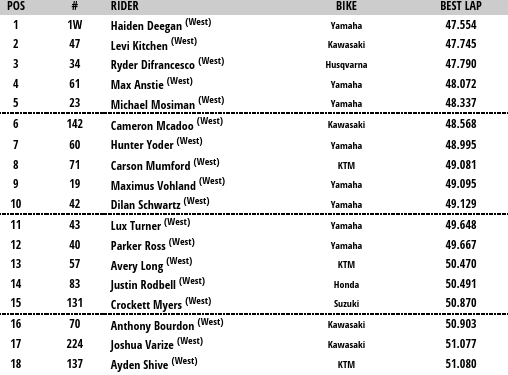 Haiden Deegan (Star Racing Yamaha) impone su ley en la primera salida a pista, aunque Ryder DiFrancesco (Rockstar Energy Husqvarna) estuvo en la cima de la sesión por momentos antes de ceder la pole provisional por poco más de dos décimas. Otra sesión de cronos muy luchada que genera grandes expectativas.