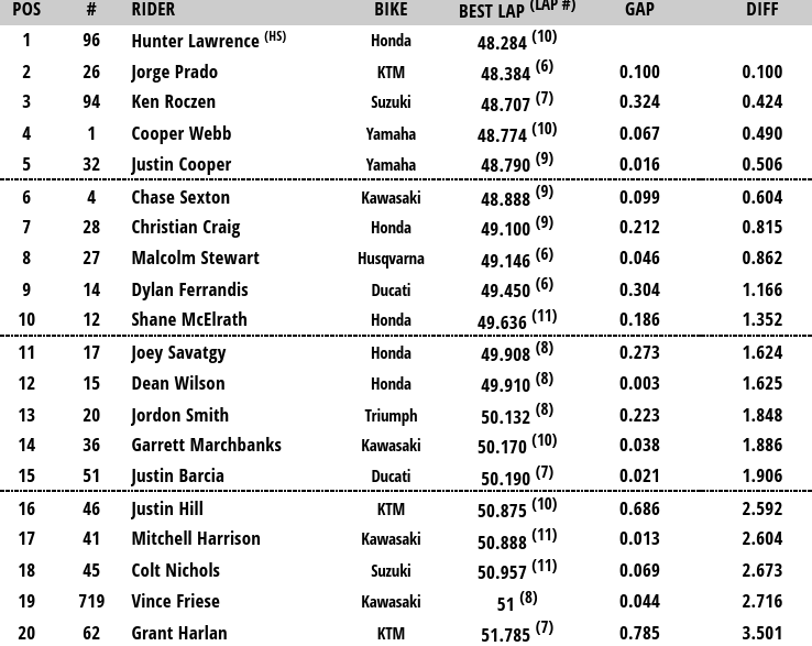 Sin embargo, en el último giro, Hunter Lawrence (Honda HRC) consiguió superarle por apenas una décima, arrebatándole la primera posición en la vuelta decisiva. Ken Roczen (HEP Suzuki) completó el top 3.