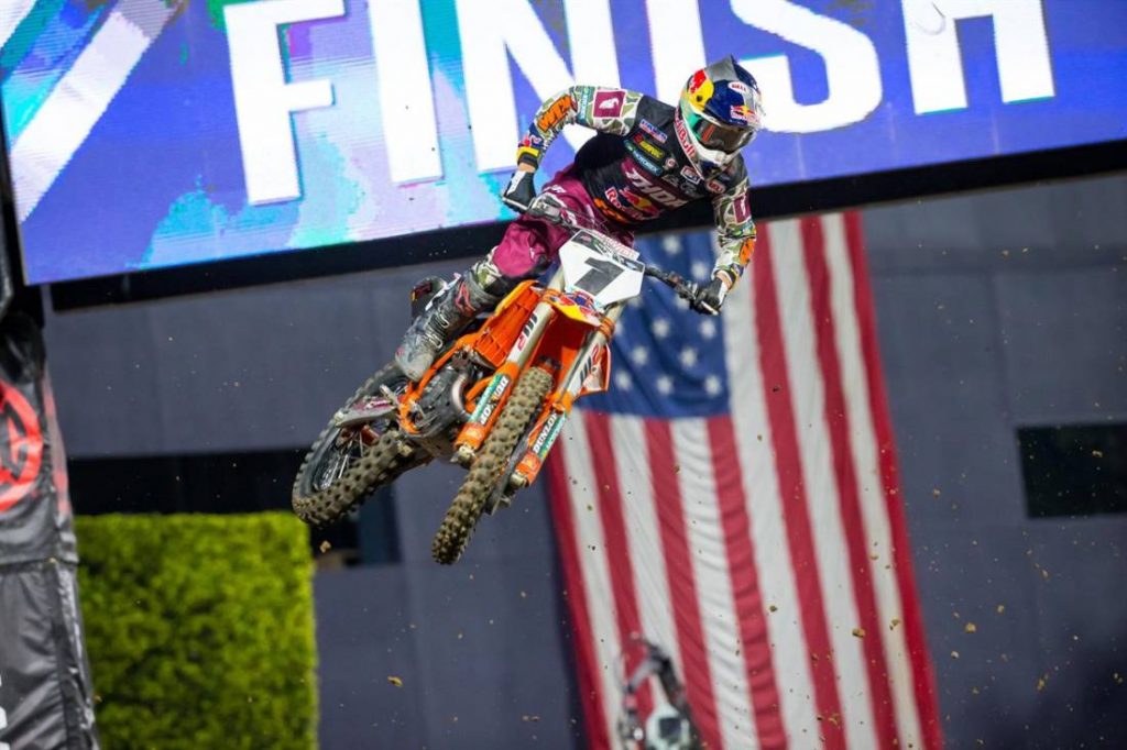 Lo dicho, el Campeón Cooper Webb ofreció una auténtica exhibición este fin de semana con una actuación magistral que le valió para sumar su primer triunfo de la temporada. Buena salida, una vez más, pero en esta ocasión con la velocidad necesaria para rodar en cabeza persiguiendo a Adam Cianciarulo durante buena parte de la carrera después de que este le adelantara nada más empezar. Con el paso de las vueltas Webb fue acercándose al piloto de Kawasaki, este se defendió como pudo de sus ataques pero tuvo que acabar sucumbiendo al mejor ritmo del del KTM. Lo de Webb en los whoops fue simplemente increíble, saltando ambas secciones con un 3-4-4 impecable, ganando montoneras de tiempo en cada vuelta y de paso desgastando mucho menos su físico. Así valoraba el ahora 3r clasificado de la general su noche: