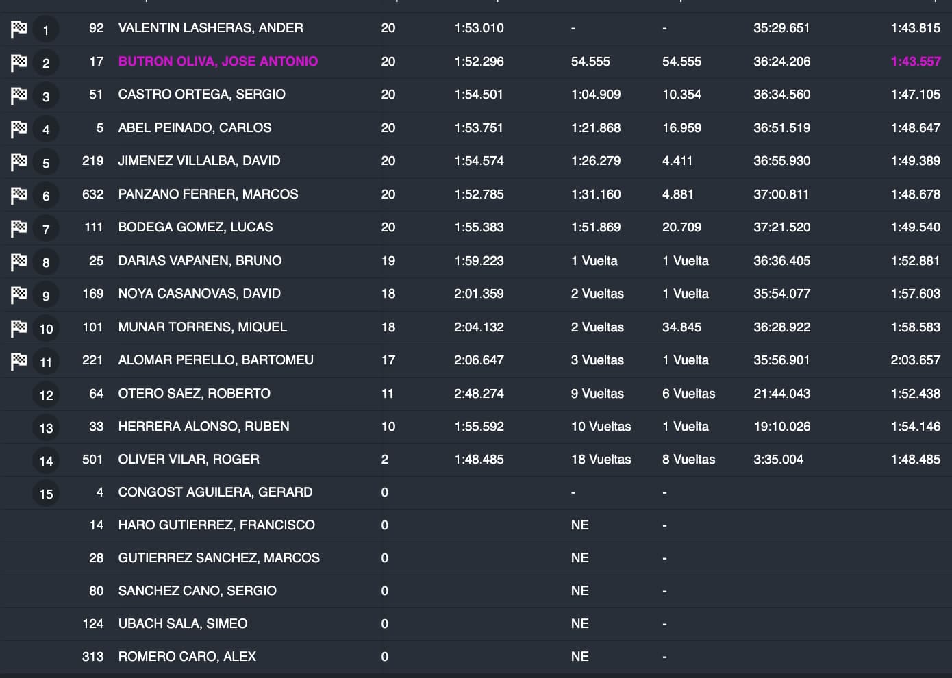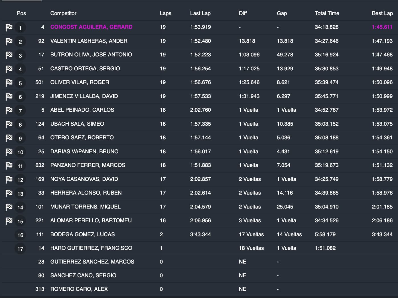 Entre todo lo sucedido, Castro finalizaba tercero Carlos Abel era cuarto y David Jiménez lograba la quinta posición.