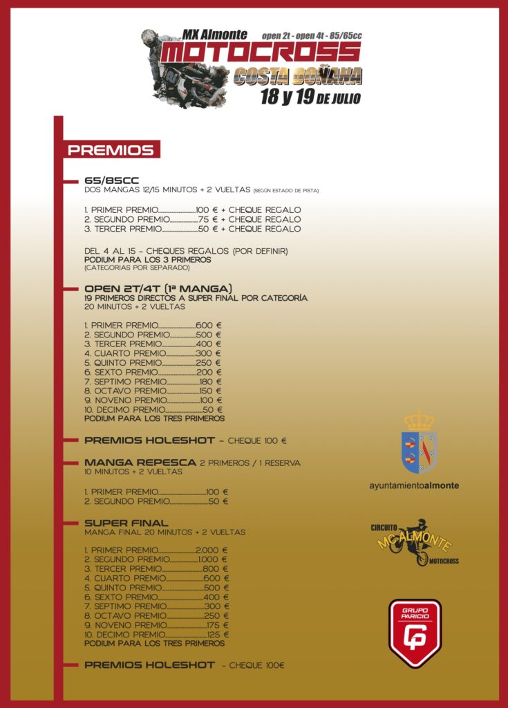 Ya conocemos los premios que se repartirán entre los mejores de las categorías Open 2T, 4T y 65cc y 85cc. Sin duda, los importes en metálico y los obsequios responden al buen trabajo que se está realizando por parte de la organización, a cargo del ex piloto Antonio Paricio y el el Moto Club Almonte.