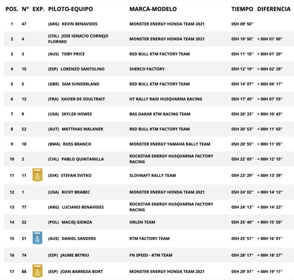 Kevin Benavides se ha llevado la quinta especial del Dakar 2021 y se sitúa en la primera posición provisional en detrimento de Xavier de Soultrait. El argentino, junto con Nacho Cornejo, ha sido el mejor durante todo el día, aunque casi se le escapa la victoria parcial al sufrir una caída a pocos kilómetros para llegar a meta que ha acabado con una fractura en su nariz.