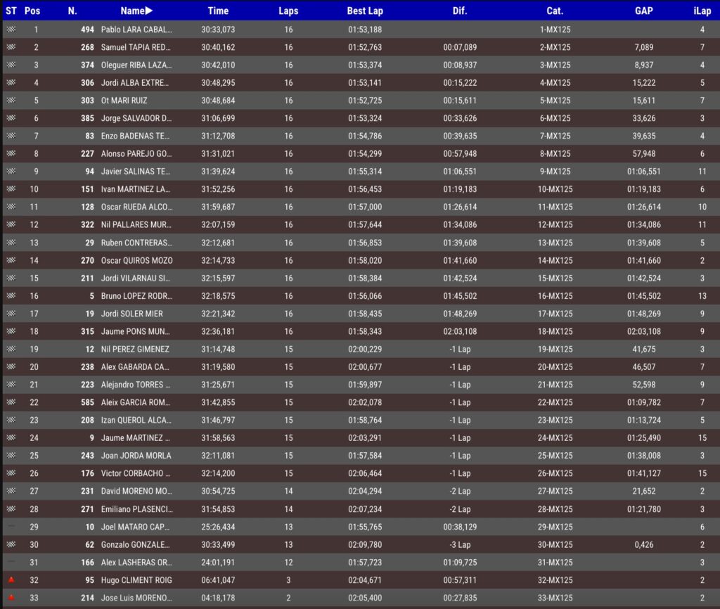El MX125 ha sido el que ha acabado con una larga jornada en territorio murciano. Pablo Lara, que se lesionó en los entrenamientos de Calatayud, ha regresado a la competición con mucha fuerza llevándose a placer la primera manga. Samuel Tapia, en una gran remontada, ha cruzado la línea de meta segundo y Oleguer Riba regresa a los puestos de honor con la tercera posición provisional.