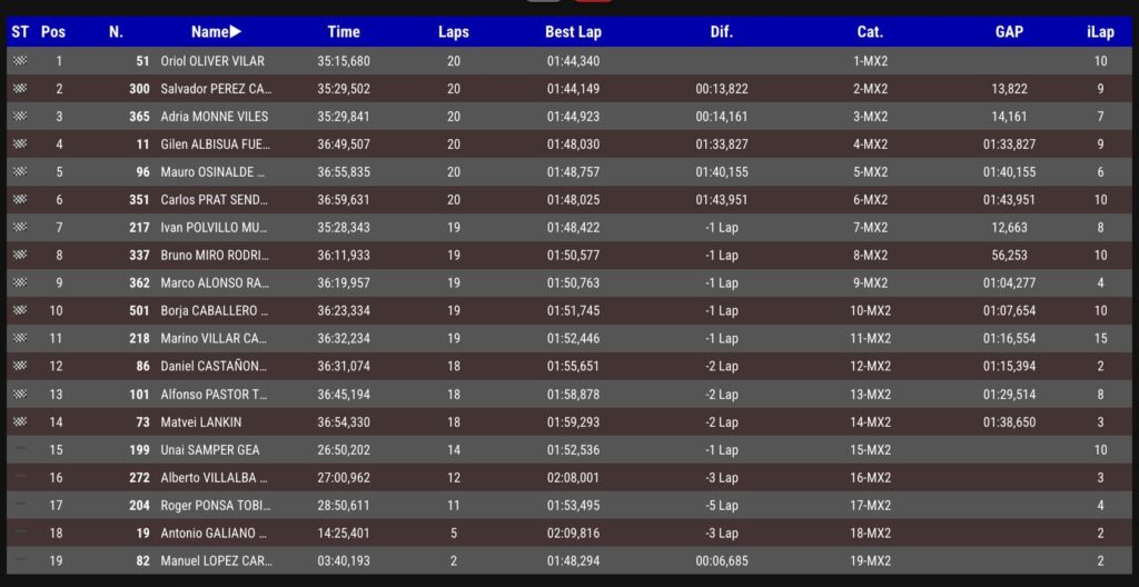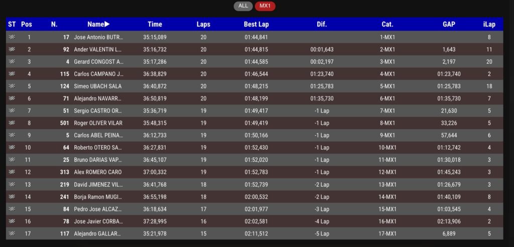 En MX1 ha sido Carlos Campano el más rápido en superar la primera curva a izquierdas del circuito de Las Salinas, aunque José Antonio Butrón se ha llevado el triunfo al liderar todos los giros. Ander Valentín ha estado apretando para ajustar los tiempos con el de TRT Motorcycles, pero no ha podido ofrecer finalmente batalla. El que si ha llegado de atrás y ha luchado por arrebatarle la segunda plaza al navarro de Motos Ausió ha sido Gerard Congost, aunque finalmente no ha podido materializar sus intenciones y se ha tenido que conformar con la tercera posición.