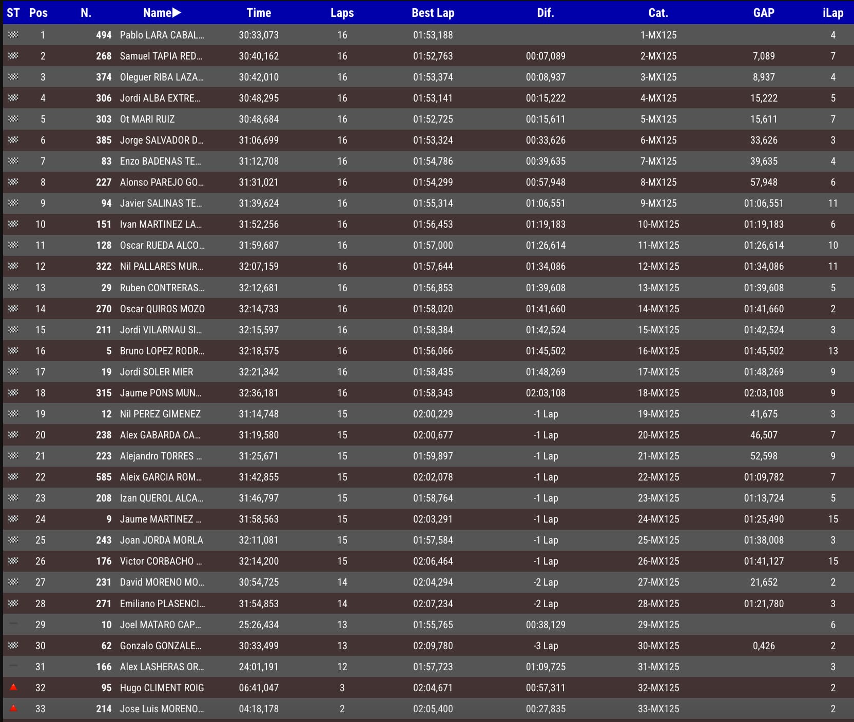 El MX125 ha sido el que ha acabado con una larga jornada en territorio murciano. Pablo Lara, que se lesionó en los entrenamientos de Calatayud, ha regresado a la competición con mucha fuerza llevándose a placer la primera manga. Samuel Tapia, en una gran remontada, ha cruzado la línea de meta segundo y Oleguer Riba regresa a los puestos de honor con la tercera posición provisional.