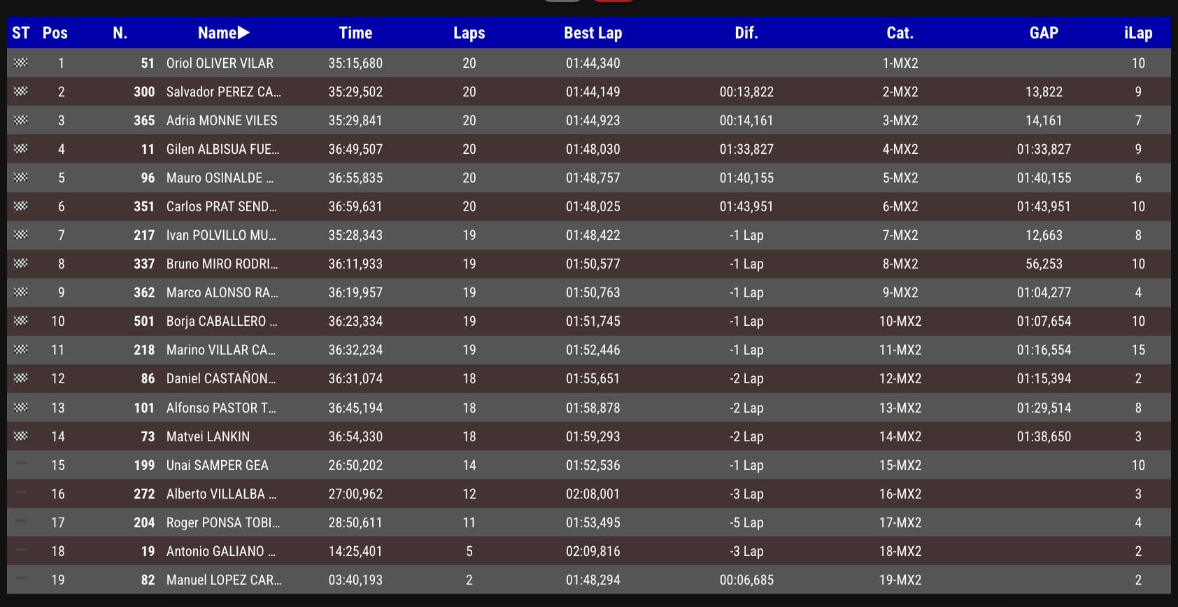 En MX1 ha sido Carlos Campano el más rápido en superar la primera curva a izquierdas del circuito de Las Salinas, aunque José Antonio Butrón se ha llevado el triunfo al liderar todos los giros. Ander Valentín ha estado apretando para ajustar los tiempos con el de TRT Motorcycles, pero no ha podido ofrecer finalmente batalla. El que si ha llegado de atrás y ha luchado por arrebatarle la segunda plaza al navarro de Motos Ausió ha sido Gerard Congost, aunque finalmente no ha podido materializar sus intenciones y se ha tenido que conformar con la tercera posición.