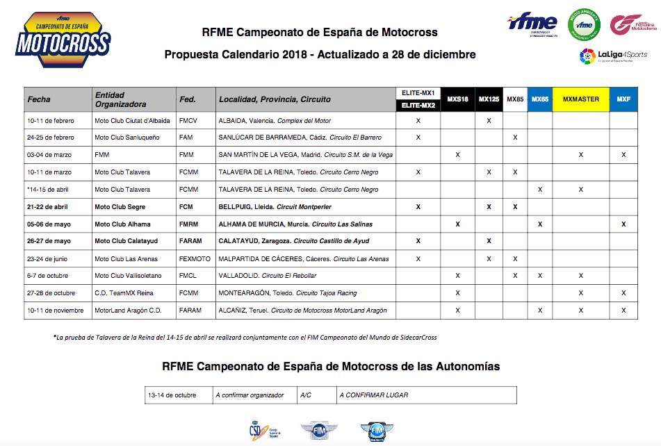 El calendario del Campeonato de España de Motocross 2018 cuenta esta temporada con seis carreras. Albaida, que vuelve al panorama Nacional tras un año de parón, abrirá una temporada que finalizará el mes de junio, por lo que no habrá carreras después del verano.
