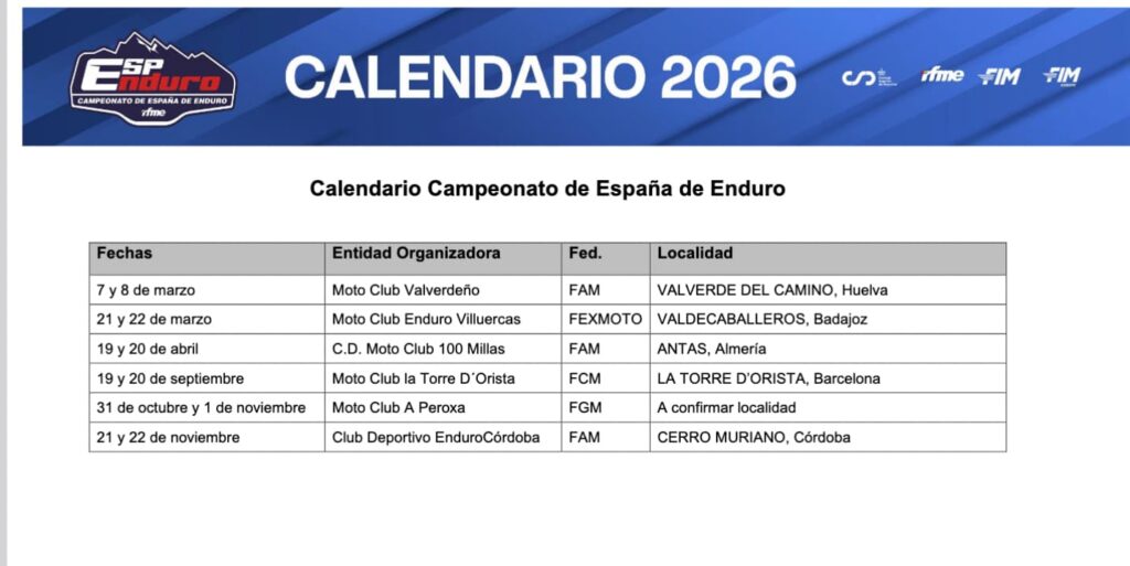 La RFME ya ha confirmado los calendarios para la temporada 2026. En el caso del Campeonato de España de Enduro, las fechas y localizaciones son casi definitivas, aunque falta por saber dónde se disputará la penúltima cita.