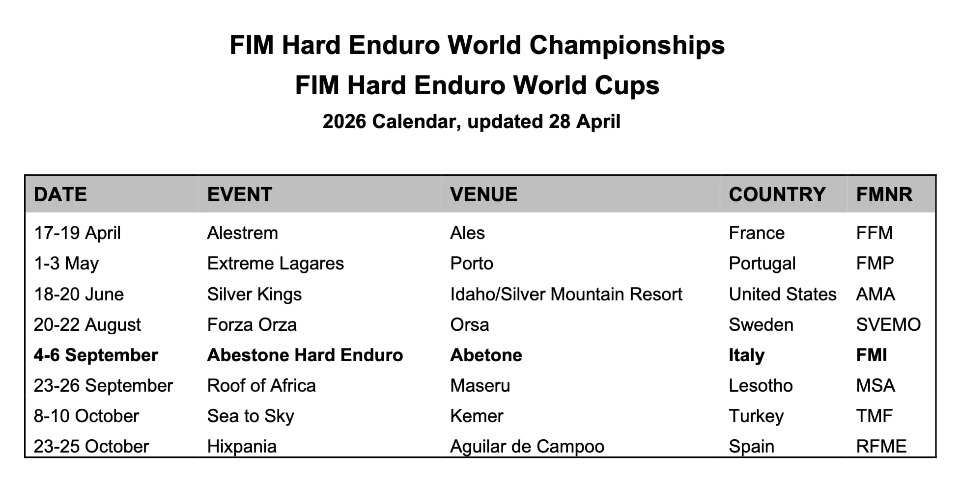 La sexta prueba del campeonato, originalmente programada como Abestone Rodeo Miravalle (Italia) del 10 al 12 de julio, se celebrará ahora del 4 al 6 de septiembre de 2026. El evento pasará a llamarse Abestone Hard Enduro y seguirá contando con la misma organización experimentada. Celebrado en la región de Toscana, en la localidad de Abestone, el evento volverá a consolidarse gracias a su gran éxito, con un importante apoyo local y una afición apasionada que se espera que asista.