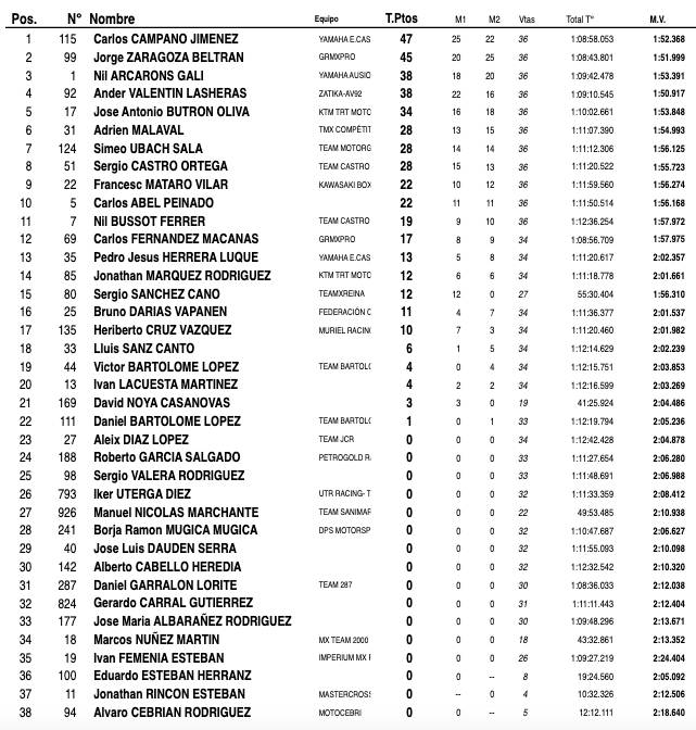 Tercero ha acabado Nil Arcarons, que ha cuajado un buen fin de semana siendo tercero en la segunda manga y cuarto en la primera. De este modo, la clasificación queda muy apretada con Butrón como líder con solo dos puntos sobre Campano y tres sobre Ander Valentín.