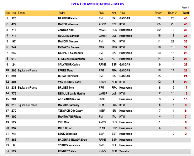 Carlos Salvador ha sido el mejor piloto español del Mundial de 85cc en Grecia. El joven ha sido noveno en el cómputo global de las mangas, en las que el mejor ha sudo el italiano Mattia Barbieri, que ha estado seguido por el checo Vitzeslav Marek y el húngaro Noel Zanocz.