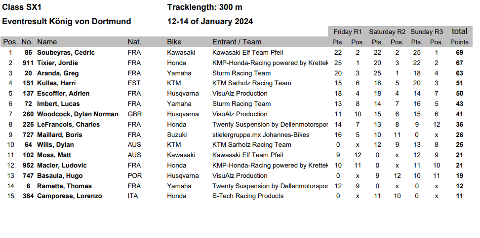 Frenchman Cedric Soubeyras finally reached the King of Dortmund honors in the 39th edition of the event. Soubeyras´s consistency was key in getting the title in the three-day racing event, including a Triple Crown format on Sunday. On the other hand, the Dortmund SX event served as the second and final round of the ADAC SX Cup Title, which was Greg Aranda who calimed it.