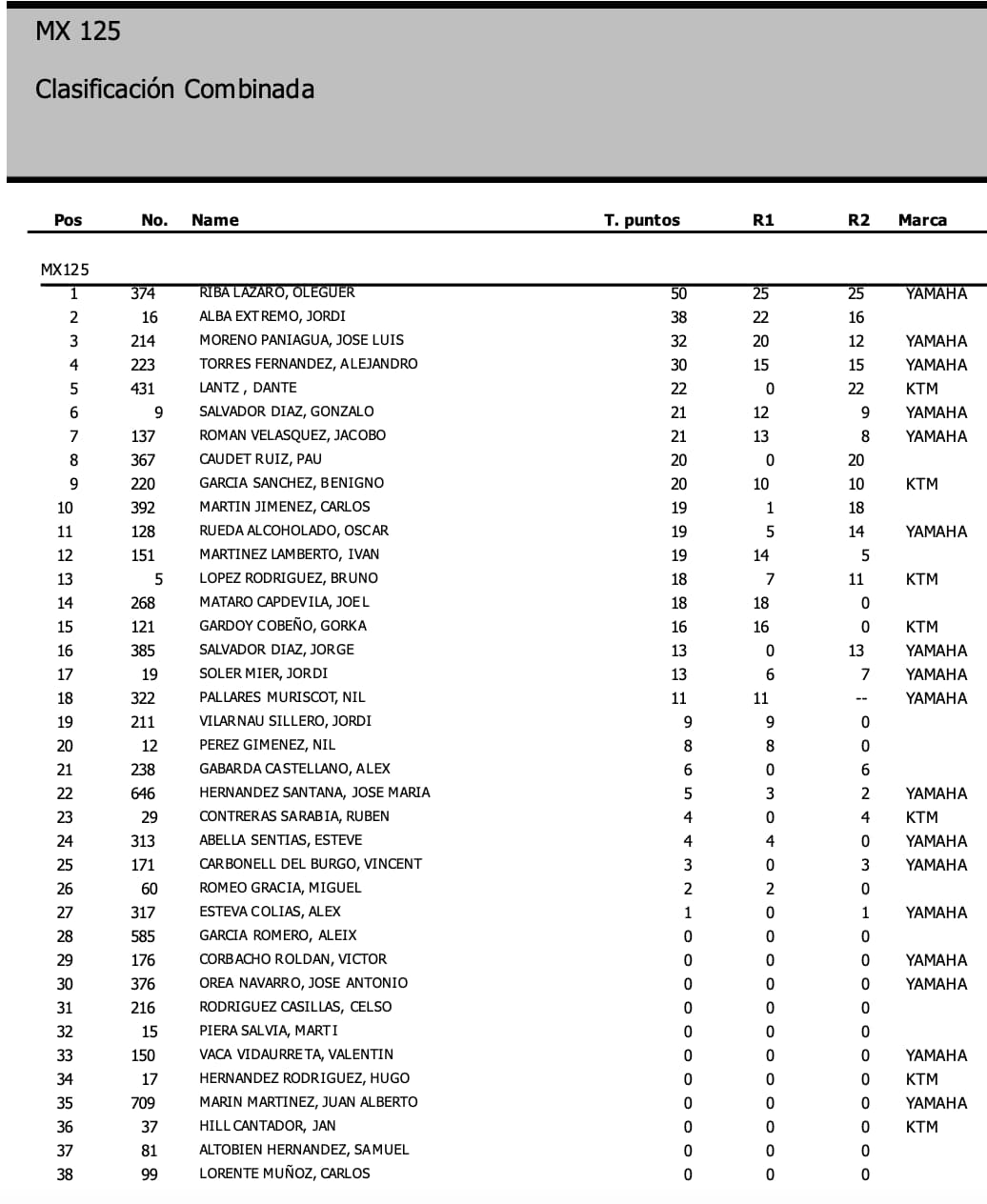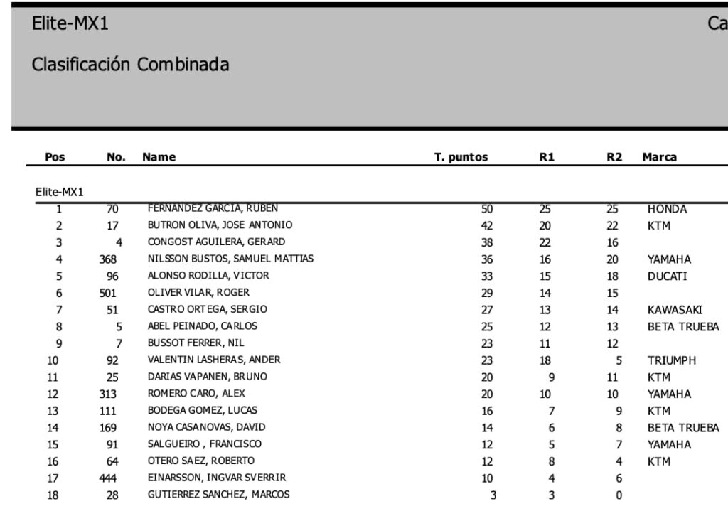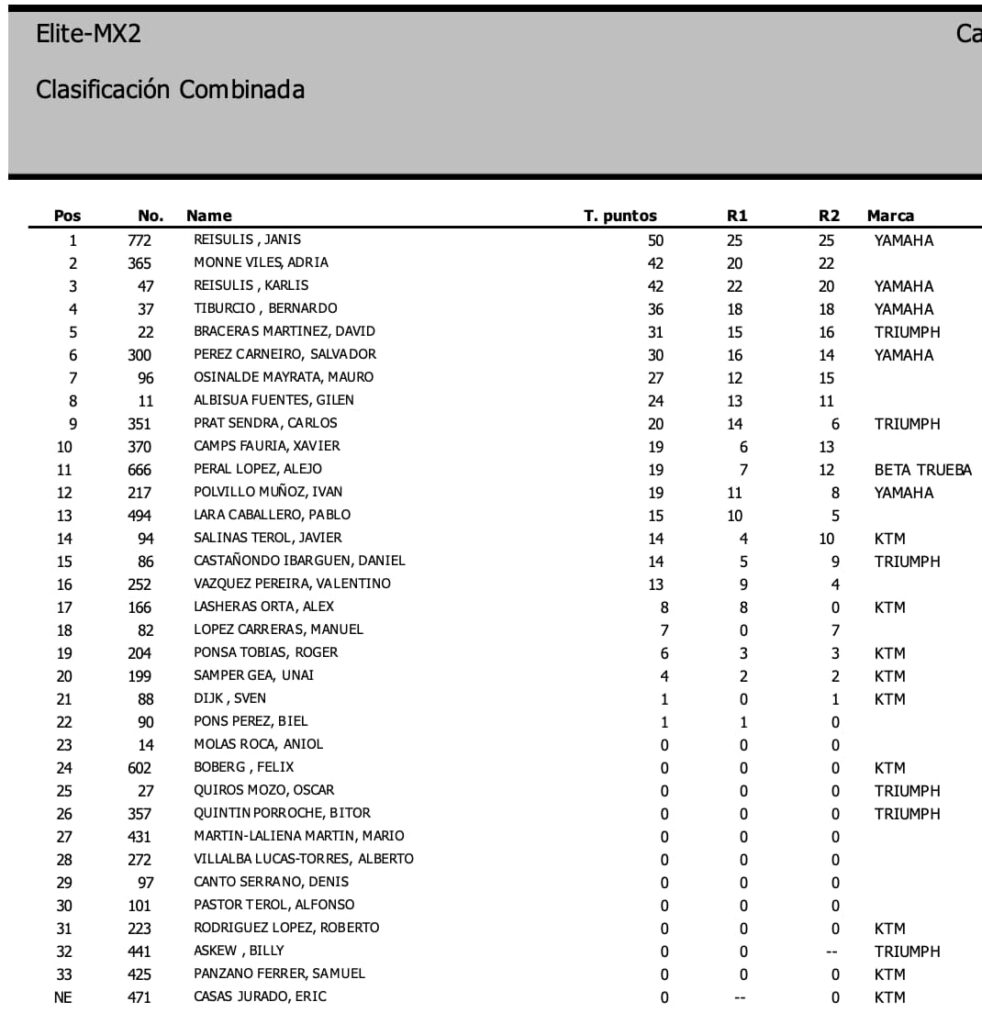 Esta NO es la clasificación general provisional en MX1 y MX2, ya que se deben sumar los puntos de las mangas clasificatorias: