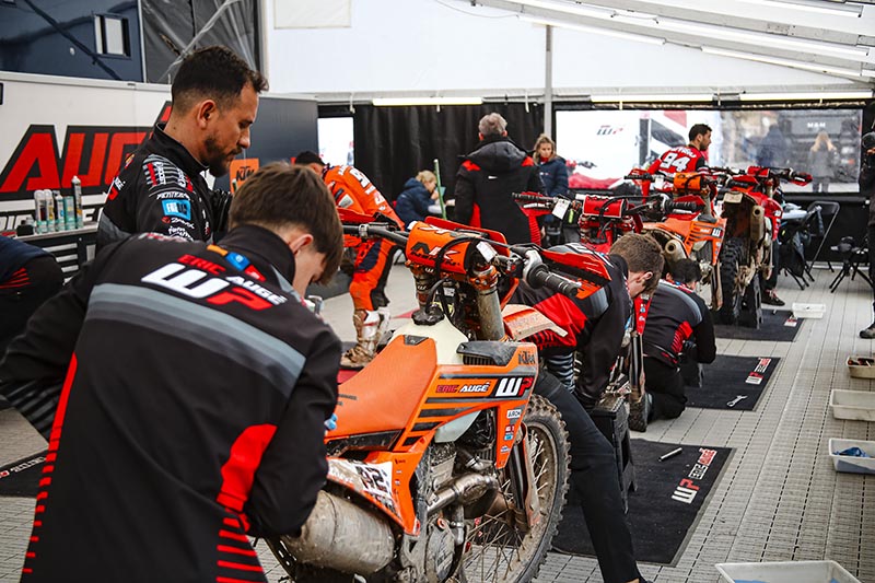 Una carrera del Mundial es, al final, una carrera convencional de enduro de toda la vida. Contamos habitualmente con 8 o 10 pilotos, lo tenemos todo muy por la mano, las motos ya llegan hechas del taller y prácticamente no hace falta trabajar en ellas. En cambio, en los ISDE, también vienen preparadas, pero el tema es que cuando llegan los pilotos, habitualmente hay quien quiere montar cosas suyas, otros quieren poner cosas nuestras, etc. Otro factor diferencial es la cantidad de pilotos, ya que en eventos como los Seis Días pasamos a tener 30 o 33 pilotos, lo que implica administrar mucho más repuesto, una gestión mucho más compleja de los controles horarios, el working area, el pre finish… todo multiplicado por 4.