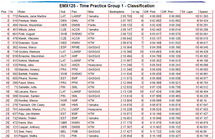 En el primer grupo Janis-Martis Reisulis se adjudicó el mejor tiempo tras marcar un tiempo de 2:05.705, poco más de dos segundos sobre Mads Fredsoe. Por su parte Marco Alonso anotó su mejor registro en la séptima vuelta que le colocó en octavo lugar, consiguiendo así un holgado pase a las mangas.
