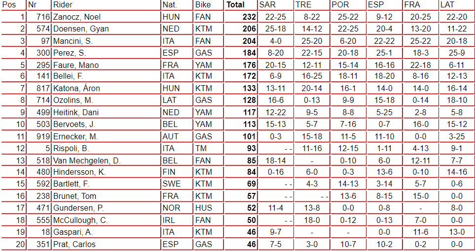 Por su parte Francisco García Ocaña ha terminado 18º en la general con un 11-22 en mangas. El piloto de RFME GasGas continúa entre los diez mejores, ocupando la octava plaza del campeonato con 123 puntos.