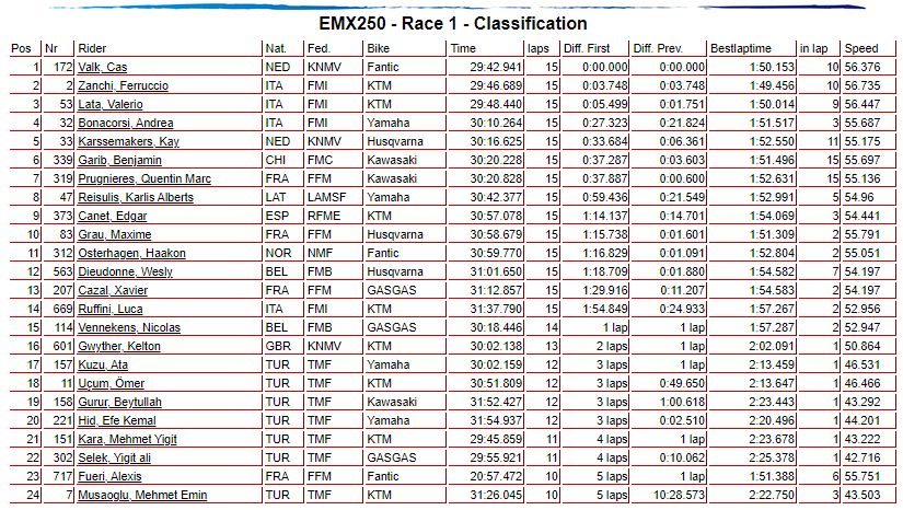 El autor de la pole,Maximilian Grau, comenzaba liderando los primeros compases tras conseguir el holeshot, pero a los siete minutos padecía una caía que le costaba la primera plaza. Esto permitió a Cas Valk situarse en cabeza, aunque no por mucho ya que Valerio Lata lograba adelantarle. Sin embargo, el holandés supo reaccionar y reconquistar la primera posición esta vez para sostenerla hasta el final. Ferruccio Zanchi remontó hasta la segunda posición dejando a Lata tercero. Andrea Bonacorsi y Kay Karssmakers completaron el top 5.
