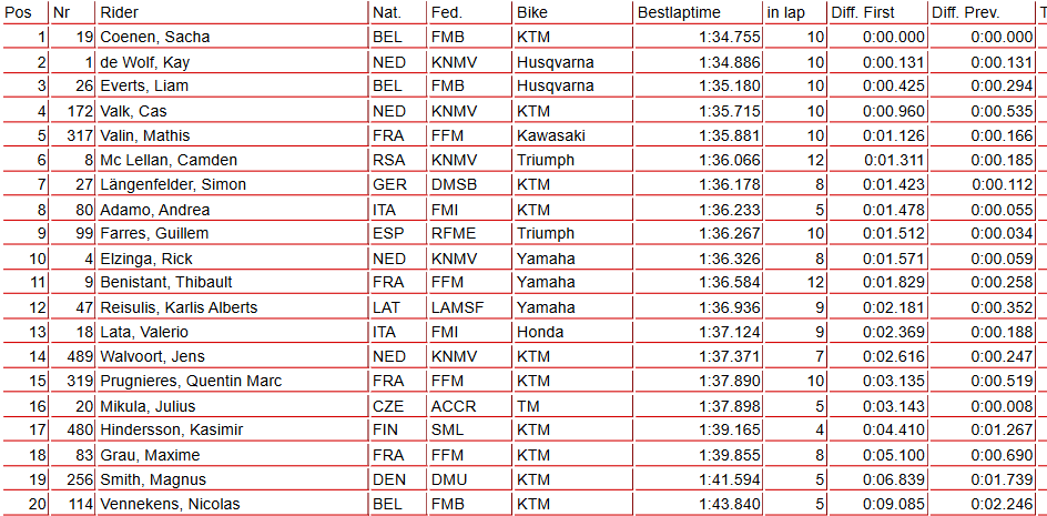 En MX2, la sesión cronometrada fue mucho más ajustada. Sacha Coenen (Red Bull KTM) se adjudicó la pole con un tiempo de 1:34.755, superando por estrecho margen a los pilotos de Neestan Husqvarna, Kay de Wolf (+0.131) y Liam Everts (+0.425).