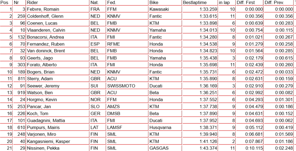 El líder del campeonato, Romain Febvre (Kawasaki KRT), sufrió una caída en los primeros compases tras un contacto con Glenn Coldenhoff, lo que lo obligó a remontar desde fuera del Top 10 hasta el sexto lugar. Como resultado, cedió cuatro puntos ante Coenen. Coldenhoff, por su parte, quedó fuera de la zona de puntos, lo que permite a Fernández acercarse a 11 puntos del piloto de Fantic en la lucha por el tercer puesto del campeonato.