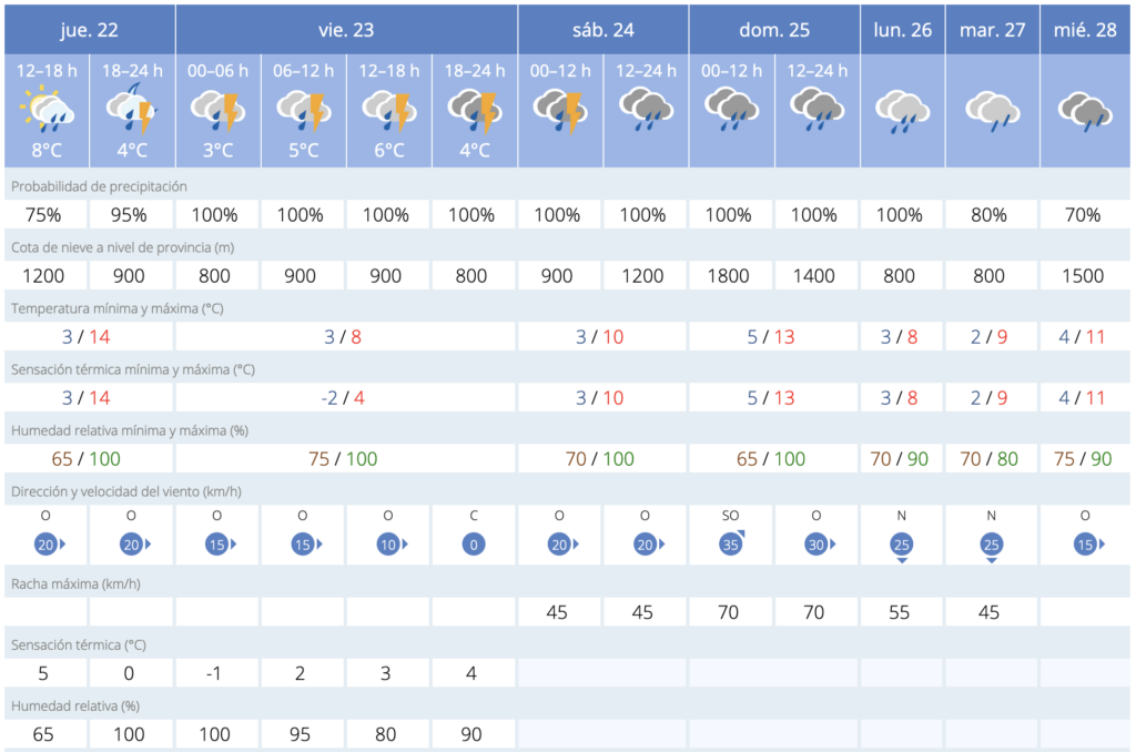 La previsión de la Agencia Española de Meteorología (AEMET) en estos momentos (jueves 18.00 horas) es la siguiente: