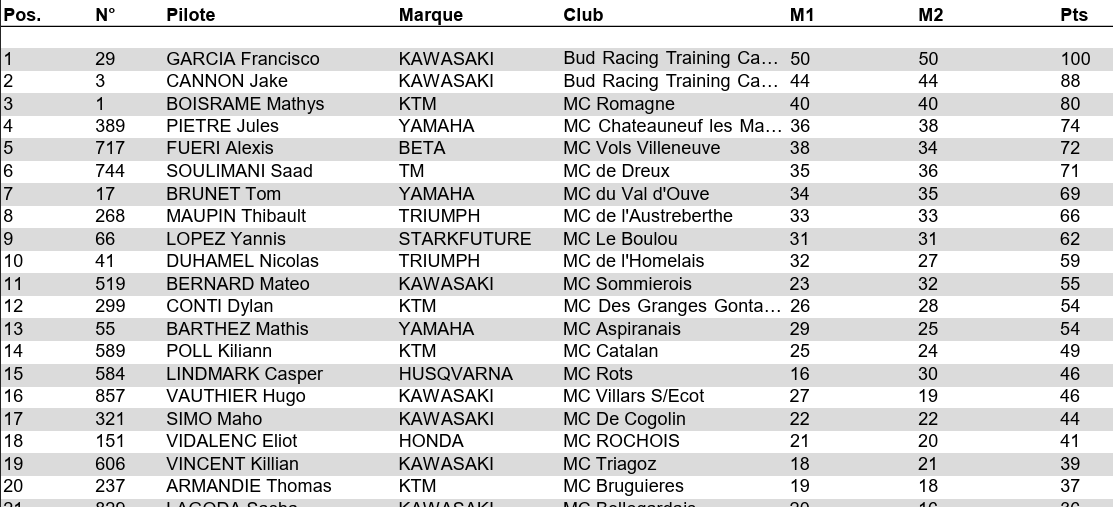 En la segunda manga, Horgmo volvió a salir decidido y lideró de principio a fin… hasta la última vuelta. Una caída inesperada le hizo ceder la victoria a su compañero Thibault Bénistant, que aprovechó la oportunidad para sellar el doblete del equipo Honda SR Motoblouz. Maxime Desprey, por su parte, cruzó la meta en tercera posición con la Yamaha GSM Dafy Michelin y de esta manera cerrar el podio vía 7-2.