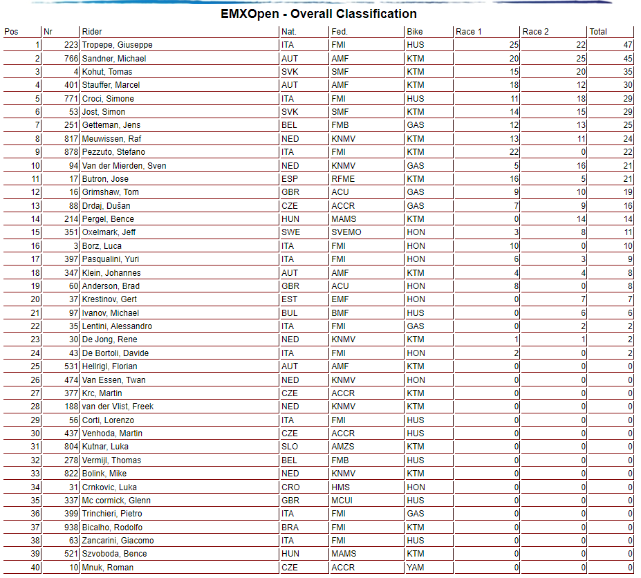 Por otro lado, el daño en puntos no fue tan grave como se podría imaginar. El de JD Gunnex mantiene la segunda plaza de la tabla de posiciones, ahora, con un déficit de 24 puntos debajo de Michael Sadner, quien hoy concluye su jornada con un segundo lugar gracias a un triunfo en la segunda manga. La victoria global quedó en manos del italiano Guisepe Tropepe. En el tercer escalón del podio arribó Thomas Khout.