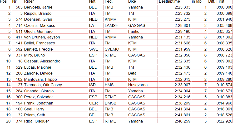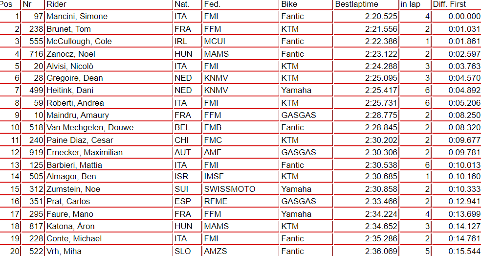 La pole absoluta ha sido para el piloto de Fantic, Simone Mancini, con un tiempo de 2:20.525 seguido por Tom Brunet +1.031 ambos en el Grupo 1. Mismo en el cual Carlos Prat obtuvo el pase directo a las mangas desde la décimo sexta plaza.