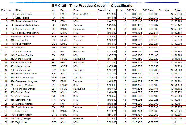 PRIMERA MANGA: Valerio Lata tomaba el FOX Holeshot pero rápidamente Cas Valk se ponía en cabeza. Lucas Coenen, tercero en ese momento, superaba a ambos vueltas más adelante para ponerse líder y escaparse delante por el resto de las vueltas hasta vencer con una jerarquica ventaja de 14 segundos sobre Valerio Lata. Para Lucas Coenen esta es su primera victoria en manga de la temporada. En tercer lugas fianlizó Ivano Van Erp imponiendo un ritmo brutal desde la posición 17 hasta arrebatarle el tercer lugar a Bobby Bruce en la última curva.