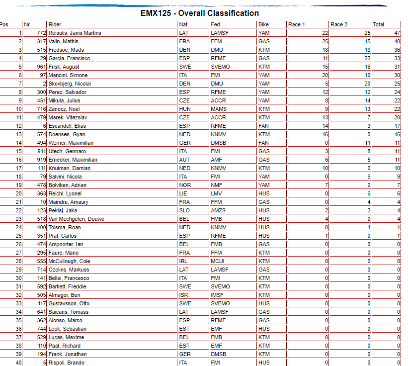 En la clasificación general, Reisulis obtuvo su tercera victoria de la temporada que le permite seguir en la cima del campeonato sobre Mathis Valin (2º). El podio fue completado por un sólido Mads Fredsoe quien obtiene su primer podio del año gracias a un regular 4-4 en mangas, aventajando por 3 puntos a Francisco Carbonero. Salvador Pérez acabó entre los diez mejores del fin de semana (8º) y Elías Escandell, afectado por un par de caídas, ha terminado 12º.