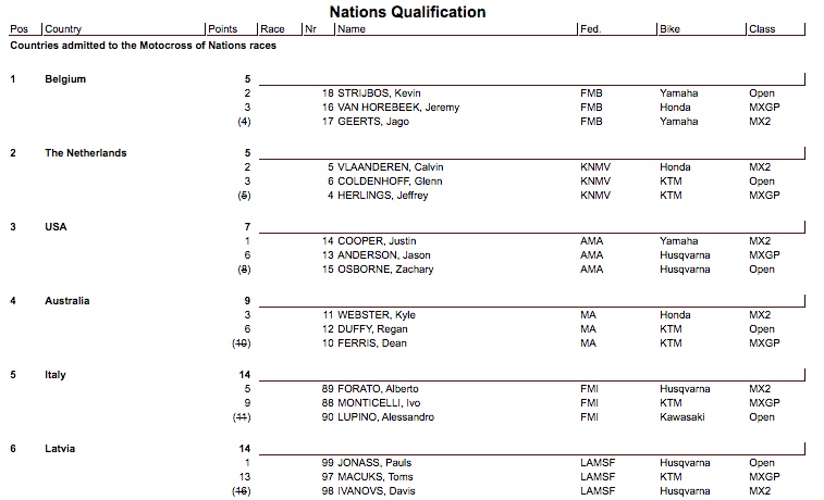 Los grandes triunfadores de la jornada han sido el equipo belga. Su «peor» resultado ha sido el quinto de Jago Geerts, y con un gran Strijbos, segundo en Open, y Van Horebeek, tercero en MXGP, han sumado solamente 5 puntos, precisamente los mismos que Holanda, que también ha gozado de una buena jornada inaugural frente a su afición.