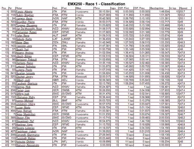 Alberto Forato se ha llevado la primera manga del EMX250 en Pietramurata. El italiano se ha beneficiado de una caída de Stephen Rubini, que es quién lideró durante las primeras vueltas, finalmente el francés ha sido 2º. Kevin Horgmo ha cerrado el Top3.