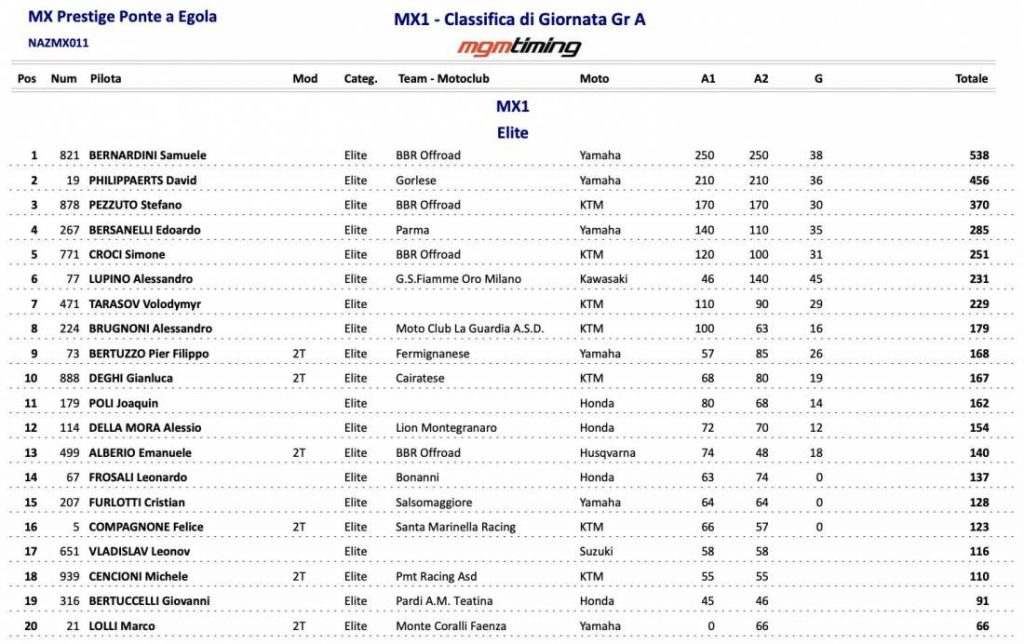 Samuele Bernardini (MX1) y Alberto Forato (MX2) se repartieron las victorias en la quinta prueba para el Campeonato Italiano de Motocross. Bernardini ganó las dos mangas por delante de un sorprendente David Philippaerts, que a pesar de estar retirado demostró que aún conserva buena parte de su velocidad, tercero fue Pezzuto. Alessandro Lupino, el gran favorito tuvo problemas en ambas mangas y solo pudo ser 6º, posteriormente se llevaría la Superfinal, en la que se juntan los 20 mejores de MX1 y MX2.
