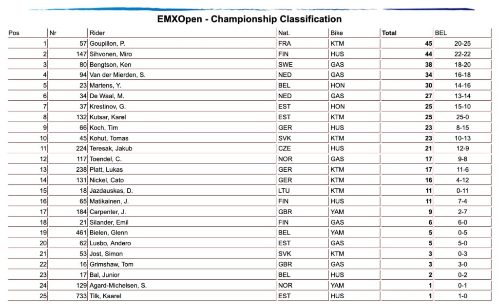 Pierre Goupillon se ha convertido en el nuevo campeón del Campeonato de Europa Open, un título que ha ostentado el último año el español José Antonio Butrón. Mientras en ediciones anteriores se disputaba el certamen a varias rondas, en este 2023 el circuito de Lommel ha sido el único escenario que ha dictaminado la sentencia. El galo de KTM consiguió el sábado la tercera posición y se llevaba el triunfo en la segunda manga del domingo, por lo que, por un punto más, relegaba de la victoria al finlandés Miro Sihvonen.