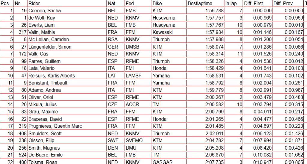 Los últimos minutos estuvieron llenos de movimientos en la tabla. Liam Everts (Nestaan Husqvarna) se colocó tercero, a tan solo una décima de su compañero de equipo. En la misma vuelta, Mathis Valin (Kawasaki KRT) escaló hasta la cuarta posición, a poco más de un segundo del líder, relegando a Camden McLellan (Monster Energy Triumph) al quinto puesto.