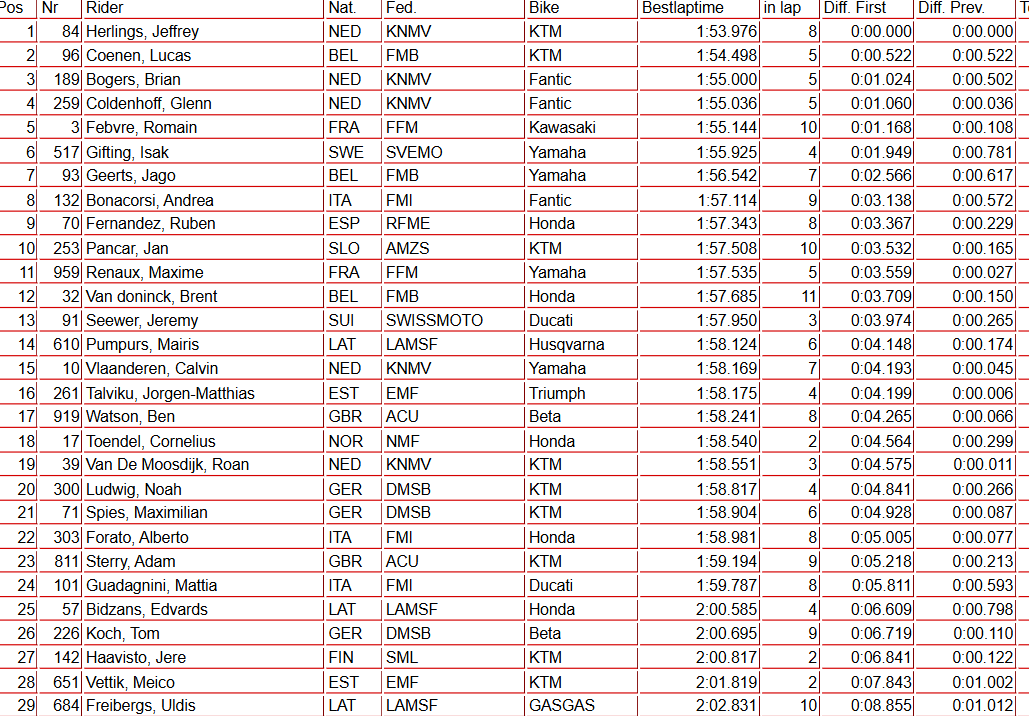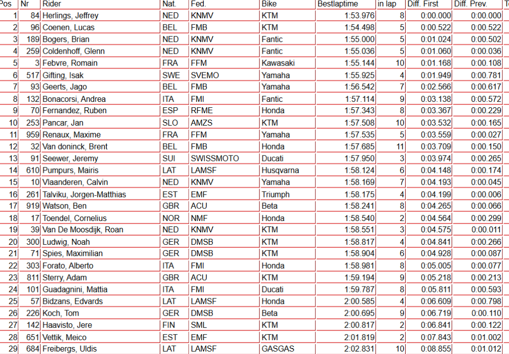 La sorpresa del día la dieron los pilotos de Fantic Factory, Brian Bogers y Glenn Coldenhoff, quienes se colaron en tercera y cuarta posición respectivamente, ambos a poco más de un segundo del tiempo de referencia. Su actuación les permitió situarse por delante del líder del campeonato, Romain Febvre (Kawasaki KRT), que finalizó quinto.