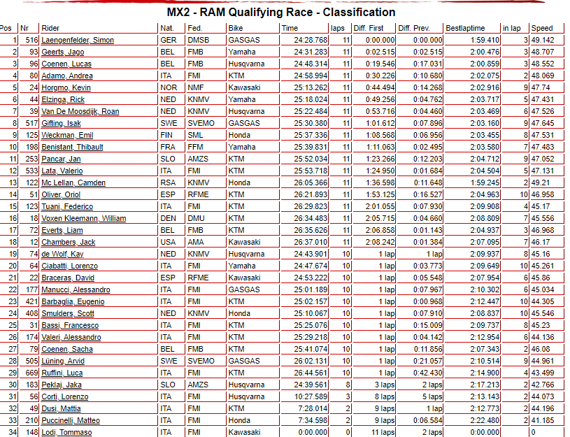Tim Gajser y Valentin Guillod se han posicionado en el tercer y cuarto lugar a medio segundo del mejor registro, en tanto que Calvin Vlaanderen fue quien ha cerrado el top 5 con un déficit de casi 1 segundo. Con distancias un poco más amplias que superan el segundo se han ubicado Seewer, Fernández, Coldenhoff, Renaux y Jonass cerrando el top 10. Prado, sin correr riesgos, ha terminado 12º.