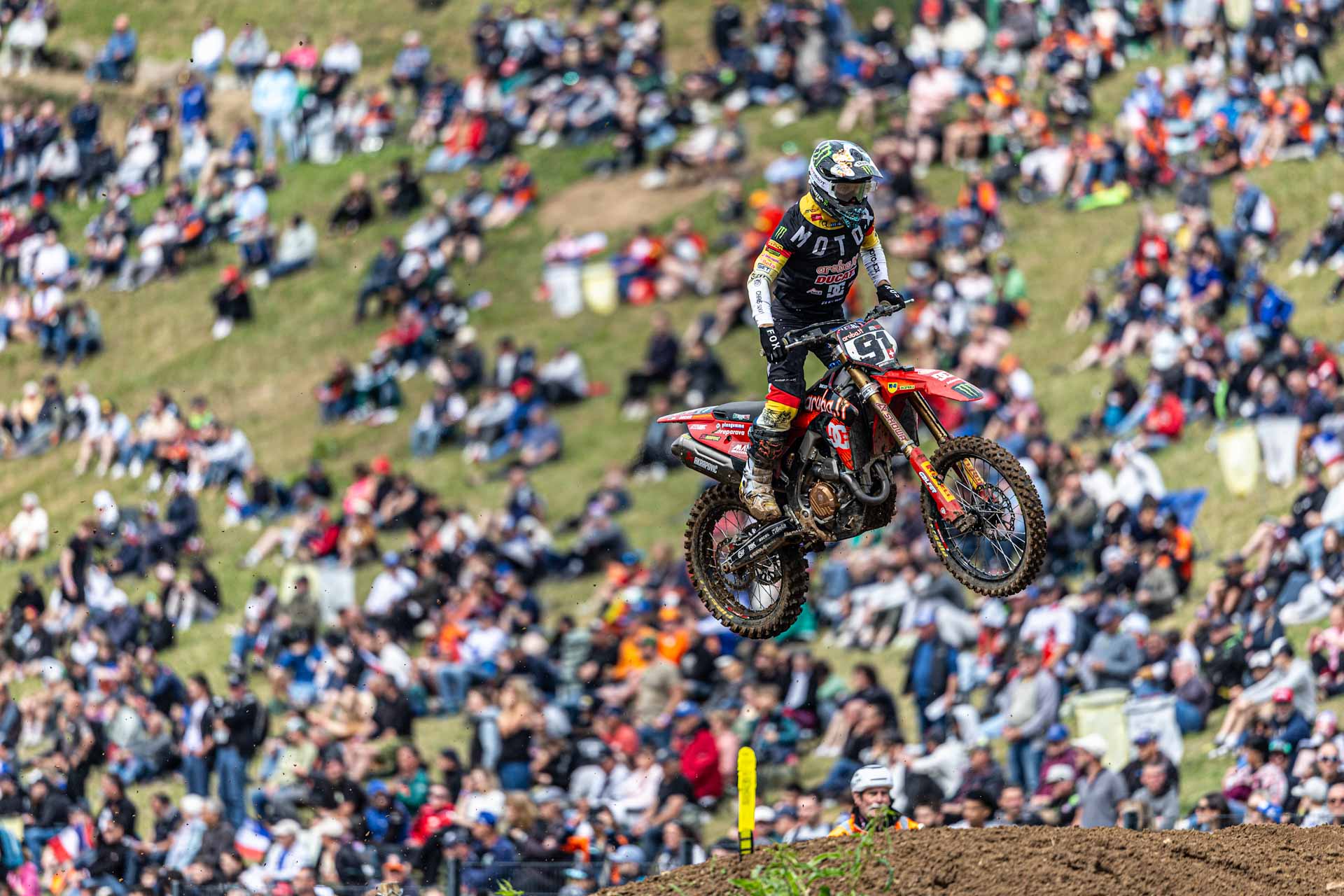 Simon Langenfelder fue el gran protagonista del fin de semana en MX2. El alemán dominó ambas mangas con autoridad, aprovechando un fin de semana complicado para Kay de Wolf, hasta ahora líder sólido del campeonato. El actual campeón del mundo padeció dos caídas en la primera manga que le relegaron al 14° puesto final. Los problemas siguieron en la segunda manga acabando