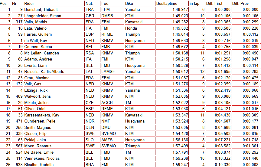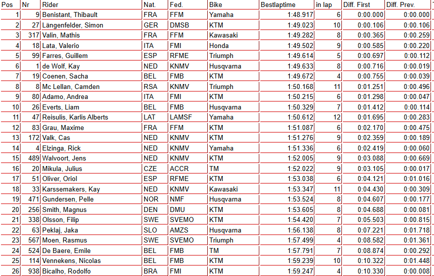 Thibault Benistant (Monster Energy Yamaha) logró su segunda pole del año, la primera desde St. Jean d’Angély, tras marcar un 1:48.917 en su sexta vuelta. El líder del campeonato, Simon Längenfelder (Red Bull KTM), quedó a tan solo una décima, tras conseguir su mejor crono en la décima vuelta.