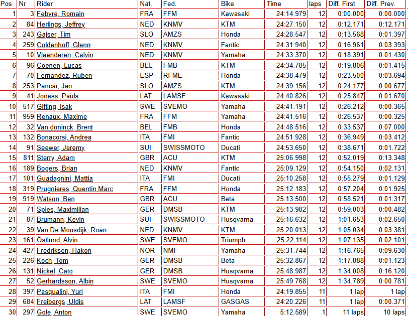 El dúo holandés de Glenn Coldenhoff (Fantic Factory) y Calvin Vlaanderen (Monster Energy Yamaha) consolidaron su carrera desde la salida para ser cuarto y quinto, respectivamente. Algo similar ocurrió con Lucas Coenen (Red Bull KTM), que no pudo pasar del sexto lugar y cedió cinco puntos clave en la lucha por el campeonato.