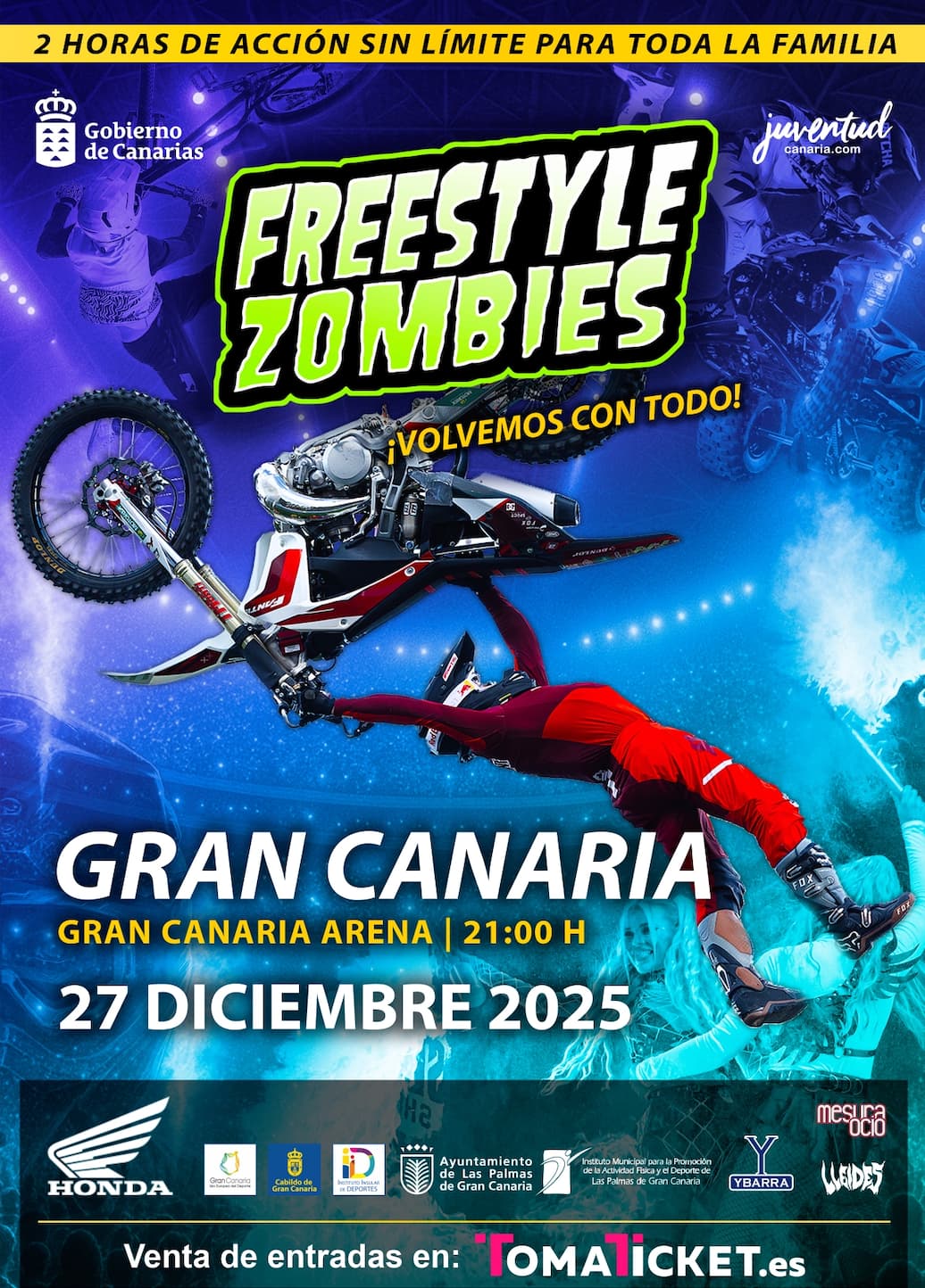 El próximo 27 de diciembre, el Gran Canaria Arena se convertirá en el epicentro de la adrenalina con la llegada de Freestyle Zombies, un espectáculo único que reunirá a los mejores pilotos y acróbatas del panorama internacional en una noche diseñada para sorprender a toda la familia.