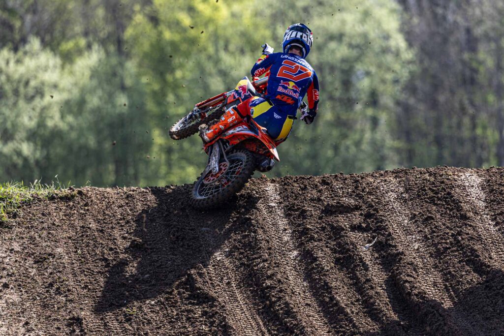 Lucas Coenen se reivindicó tras un discreto sábado en el que acabó 10° en la manga clasificatoria, y lo hace con una actuación magistral en esta primera manga. El piloto de KTM Red Bull ganó el holeshot (el primero en MXGP) y no soltó el liderato en ningún momento, firmando una victoria contundente frente a al dúo de HRC. Es el segundo triunfo en manga para Coenen desde Riola Sardo.