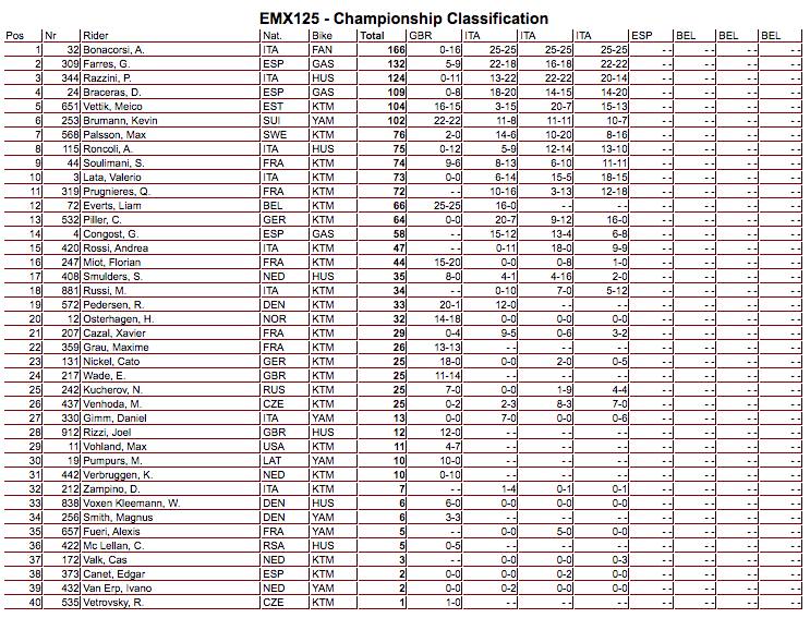 Con sus respectivos podios en el GP de Emilia Romagna, Guillem Farrés y David Braceras siguen escalando posiciones en la general del EMX125. Farrés se coloca en la segunda posición a 34 puntos de Andrea Bonacorsi, desbancando de este modo a un Pietro Razzini que hoy no ha podido emular sus actuaciones precedentes en el trazado de Faenza. Braceras, por su parte, pasa del sexto al cuarto puesto con Razzini a 16 puntos.