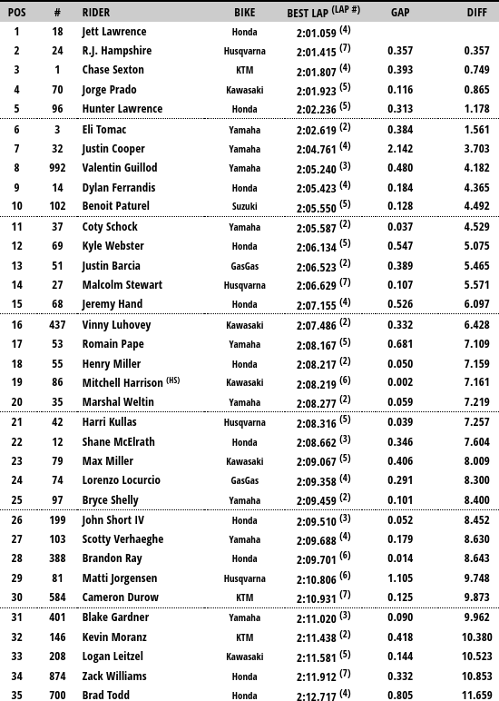El apellido Lawrence volvió a lo más alto del podio, esta vez gracias a Hunter, quien se adjudicó la victoria general con un sólido 2-2. Su consistencia, sumada a infortunios de los ganadores de manga, le permitió estrenar su palmarés en la categoría reina en su vigésima carrera en 450.