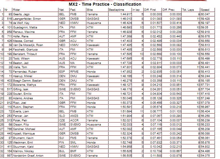 Jago Geerts y Jed Beaton también fueron parte de la múltiple caída en la que Fernández estuvo envuelto. A diferencia Fernández, pudieron reintegrarse a pista y acabar 8 y 13 respectivamente. Por otro lado, Liam Everts acabó 16 en su primera carrera en MX2.