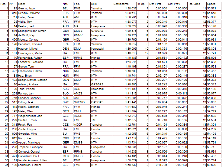 PRIMERA MANGA: Otra manga bajo el dominio de Tom Vialle ganando de princpio a fin; el francés anotó el holeshot y a partir de ahí se escapó delante para ganar su manga número 11 de la temporada. Quienes estuvieron ocupados durante toda la carrera fueron Jago Geerts y Maxime Renaux. Geerts estuvo a la caza del segundo lugar sostenido por un Isak Gifting que logró bloquear todos los huecos y defenderse de cada ataque del piloto Yamaha hasta la vuelta final, donde pudo ejecutar un sobrepaso para finalmente colocarse segundo. Enhorabuena para Gifting que logra su primer top 3 en MX2. Mientras tanto, Maxime Renaux tuvo una de las peores salidas y debió abrirse camino desde la décima octava plaza hasta el sexto lugar. Rubén Fernández escaló del puesto 10 al 6 en cuestión de dos vueltas y luego una caída de Benistant le permitió meterse al top 5, y sobre las vueltas finales pudo dar caza a Kay De Wolf para lograr un prometedor cuarto lugar que le ubica como uno de los candidatos al podio de tener otra buena manga.