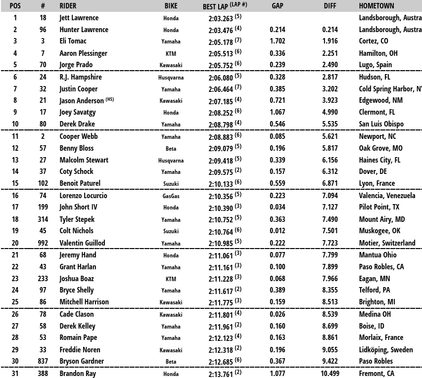 Jorge Prado se mostraba como el más veloz en la primera sesión de cronos en High Point, cuarta ronda del AMA Pro Motocross. En un principio el gallego había logrado un tiempo de 1:59.330, superando por más de 2 segundos a Justin Cooper y Jett Lawrence. Sin embargo los resultados de todas las sesiones han sido eliminados a raíz de un error en los transponerds que perjudicado a varios pilotos.