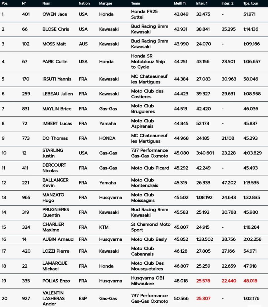 Hoy a partir de las 15:40 (hora España) comenzará la segunda y última noche del Supercross de París 2022. Hasta el momento hemos vivido un emocionante duelo entre Eli Tomac y Ken Roczen que al parecer podría volver a repeterise, incluso con mayor intenisdad, luego de que ambos hayan sido 1-2 en los cronos de hoy con ajustadas diferencias. Tomac y Roczen batallaron en las dos últimas carreras, siendo Tomac el ganador con un 1-2-1, mientras que Roczen fue segundo tras ser 3-1-2. Justin Brayton, quien fue tercero en el podio de ayer, sigue bajo el acecho de la corona tras clasificarse tercero en los cronos. Por otro lado, Marvin Musquin, quien en esta oportunidad ha clasificado en cuarto lugar, deberá darlo todo en las tres carreras que restan si quiere retener la corona. Ayer, Musquin tuvo una noche complicada sin poder pisar el podio. Los franceses Greg Aranda, Anthony Bourdon y Thomas Ramette se han impuesto sobre Cooper Webb, mientras que el top 10, que clasifica a la SuperPole de hoy, ha sido completado por C