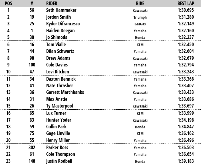 Monster Energy Pro Circuit Kawasaki’s Seth Hammaker set the fastest lap time in both sessions, with a best of 1m30.695s. He was followed by Jordon Smith (Triumph Factory Racing) and Ryder DiFrancesco (Rockstar Energy GasGas). Title contenders Haiden Deegan (Monster Energy Star Racing Yamaha) and Jo Shimoda (Honda HRC) rounded out the top five.